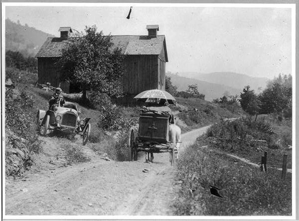 Buick roadster waits for horse-drawn wagon to pass on narrow country road above Liberty, N.Y.