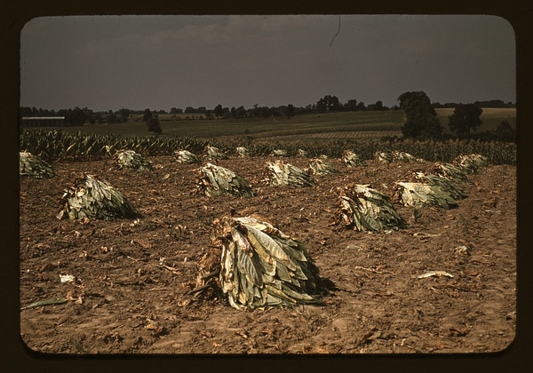 Burley tobacco is placed on sticks to wilt after cutting, before it is taken into the barn for drying and curing on the Russell Spears' farm, vicinity of Lexington, Ky.