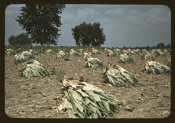 Burley tobacco is placed on sticks to wilt after cutting, before it is taken into the brn for drying and curing, on the Russell Spears' farm, vicinity of Lexington, Ky.