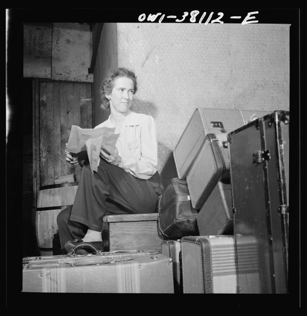 Bus trip from Knoxville, Tennessee, to Washington, D.C. Girl baggage agent checking baggage which has just come off the bus at Knoxville