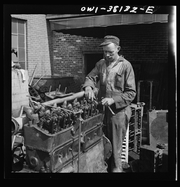 Bus trip from Knoxville, Tennessee, to Washington, D.C. Knoxville, Tennessee. A mechanic working on a brake lining at the garage of the Tennessee Coach Company