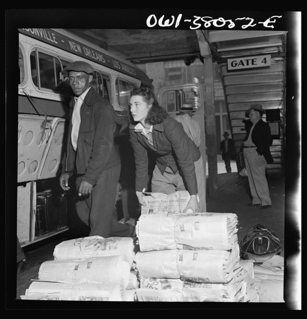 Bus trip from Knoxville, Tennessee to Washington, D.C. Girl baggage clerk loading newspapers onto a bus at Knoxville, Tennessee. These will be left at small towns along the way