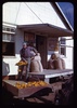 Man shovelling ears of dried corn from wagon through feed store window