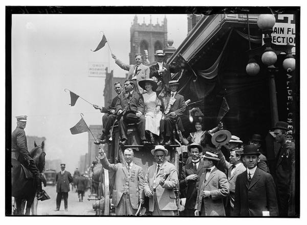 California delegates cheering on stagecoach at the 1912 Republican National Convention held at the Chicago Coliseum, Chicago, Illinois, June 18-22, 1912