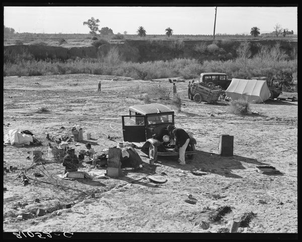 Camped on the flat. Family with five children, left their home in Texas in September 1938. They picked their way across the country in Texas and Arizona cotton. They had just entered California the night before. Near Holtville, Imperial County, California