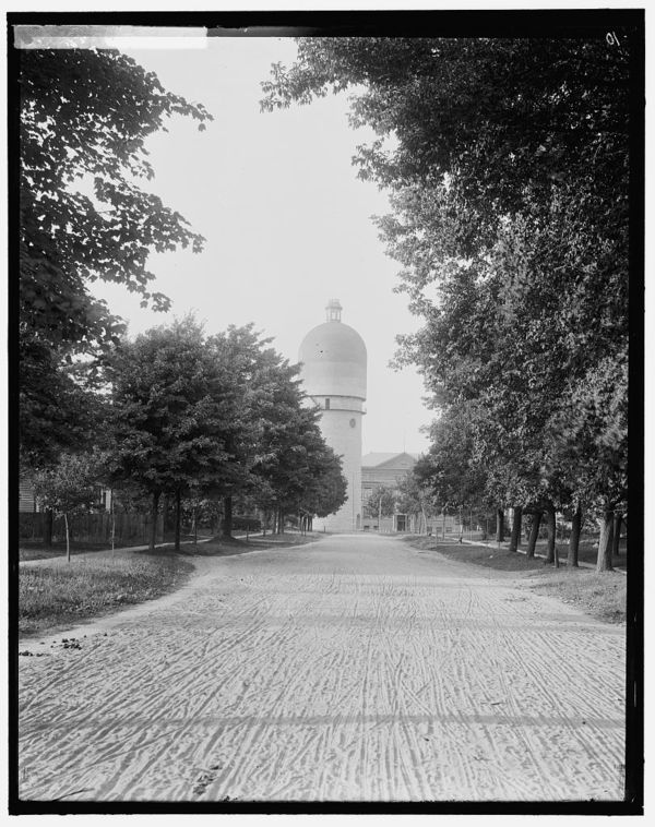 Campus road leading to stone tower, Michigan State Normal College, Ypsilanti, Mich.