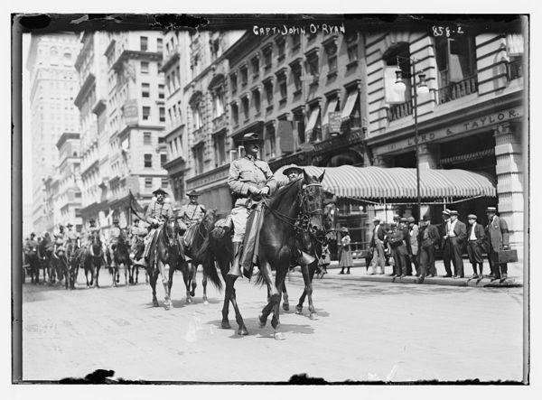Capt. John O'Ryan, on horse-back, leading 1st Battery to war game, New York