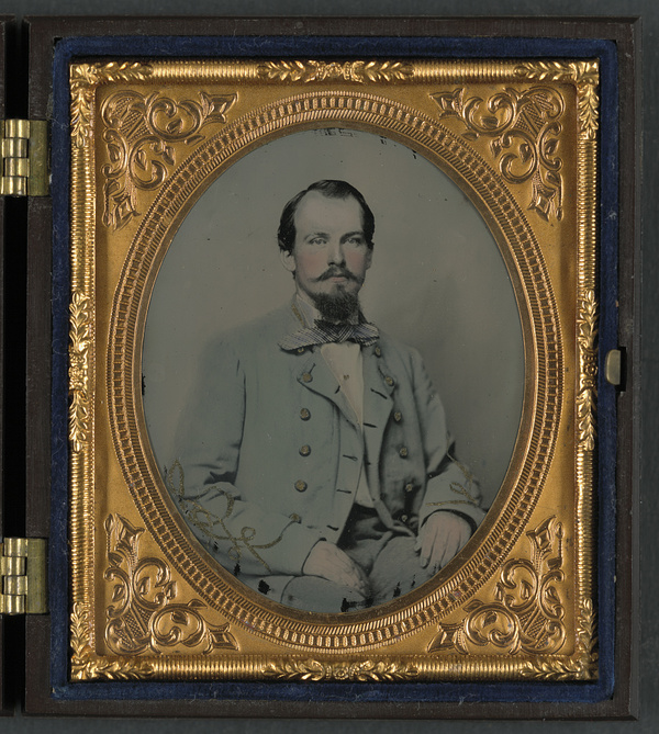 Private Joseph T. Rowland of Co. A, 41st Virginia Infantry Regiment in uniform with epaulets and kepi with pistol in belt