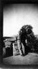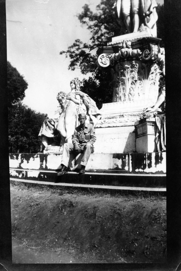Carl Birdwhistell taking a moment to pose by a statue in Italy during World War II