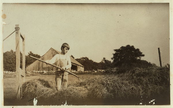 Three Saunders children, nine, eleven, and thirteen years old, mowing away the grain. See Hine Report, Rural Child Labor, August 1915.