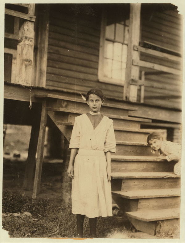 Carrie Armstrong a weaver in Highland Park mill #2 Rock Hill, S.C. A frail, stunted girl said 13 years old used to run 4 looms now runs only 2. Been working since January. Father is in the mill. Location: Rock Hill, South Carolina.