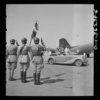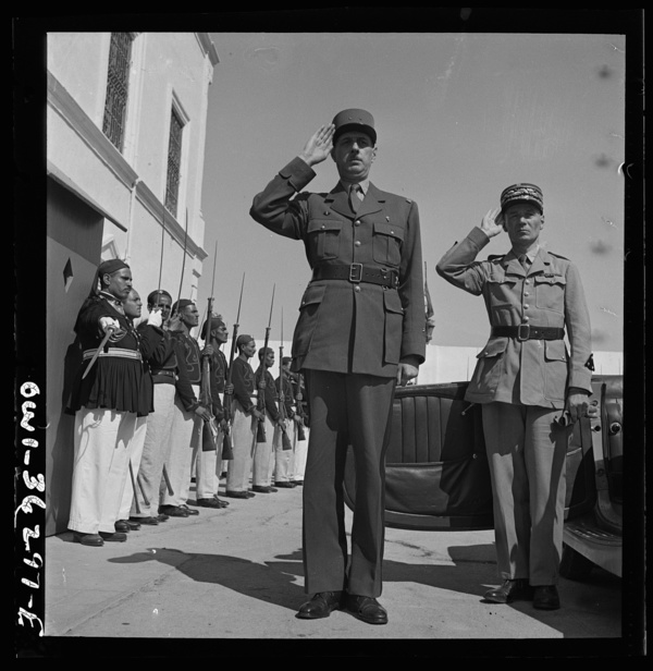 Carthage, Tunisia. General de Gaulle, accompanied by General Mast, saluting as the band plays Marseillaise outside the summer palace of the bey of Tunis