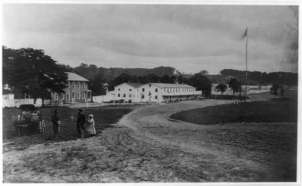 Cavalry depot at Giesboro, Md. Soldier facing man and girl with people in horse-drawn carriage in foreground