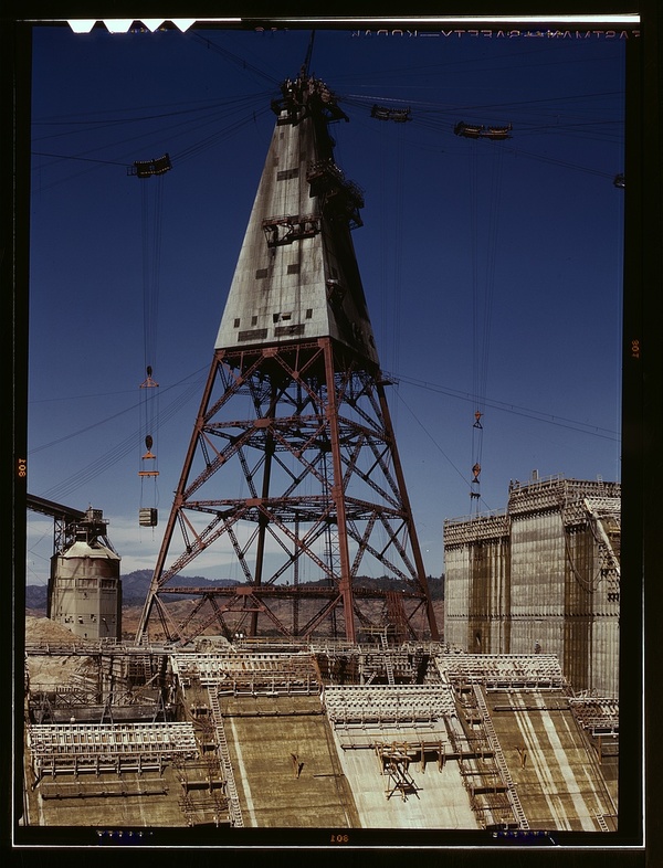 Central tower from which cable buckets carry materials used in the construction of Shasta dam, California