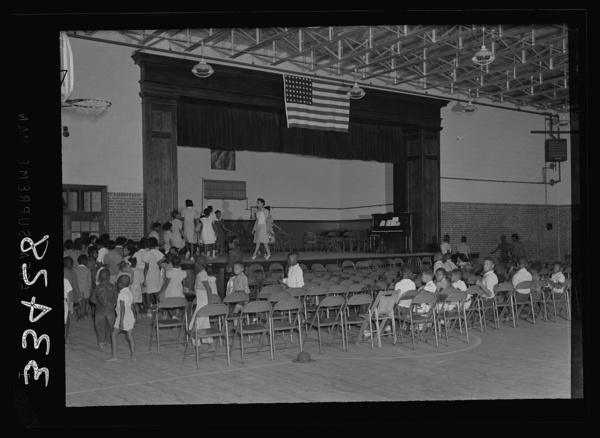 Charlotte Court House, Virginia. Central High School. A combination gym and auditorium where the seats are movable. The elementary school has no auditorium so the children have come over to pratice an operetta