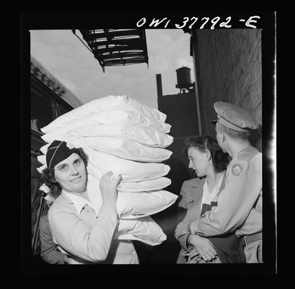Chicago, Illinois. A pillow girl waiting to board a bus at the Greyhound bus terminal