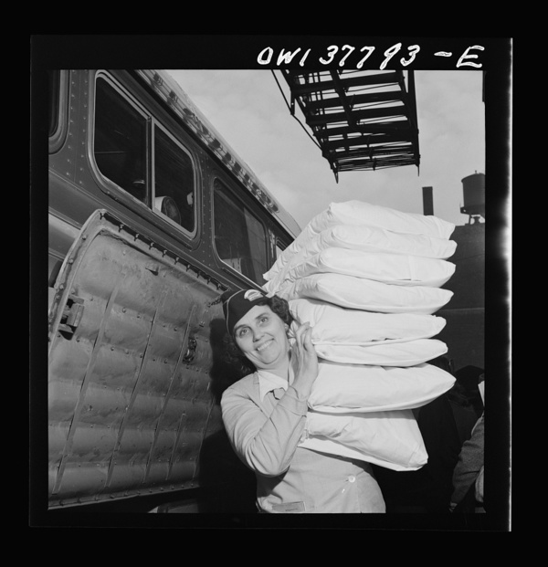 Chicago, Illinois. A pillow girl waiting to board a bus at the Greyhound bus terminal
