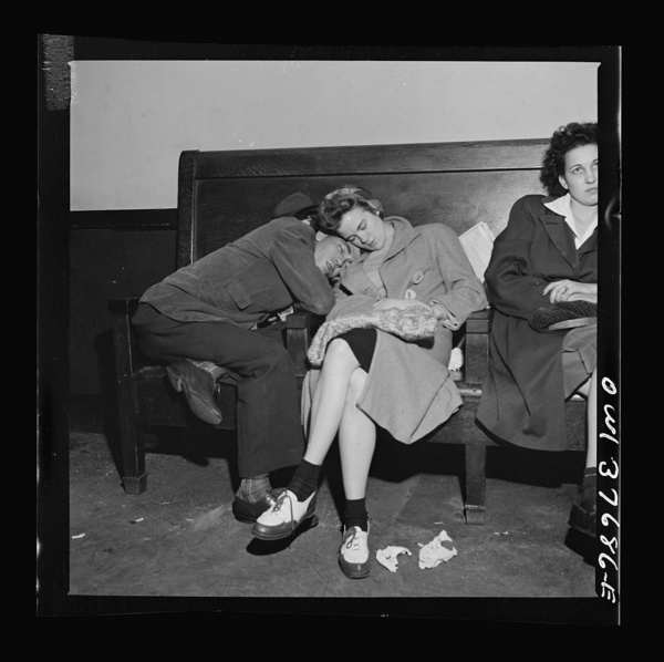 Chicago, Illinois. Private D.N. Danielson, stationed in North Carolina, and Mrs. Danielson, from Minnesota, in the waiting room of the Greyhound bus terminal. They met in Chicago to save time for his furlough