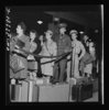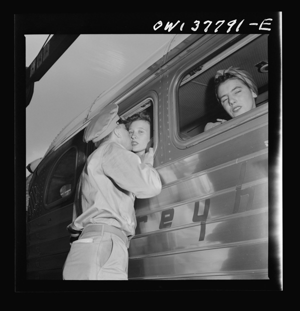 Chicago, Illinois. Private D.N. Daniels kissing his wife goodbye at the Greyhound bus terminal