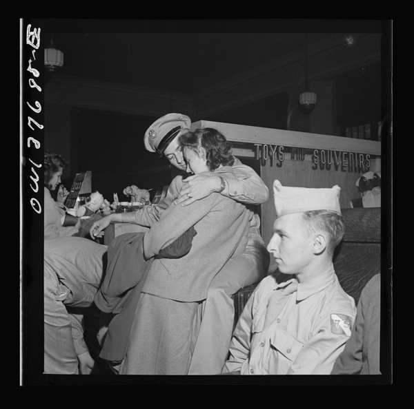 Chicago, Illinois. Private D.N. Danielson, stationed in North Carolina, and Mrs. Danielson, from Minnesota, in the waiting room of the Greyhound bus terminal. They met in Chicago to save time for his furlough