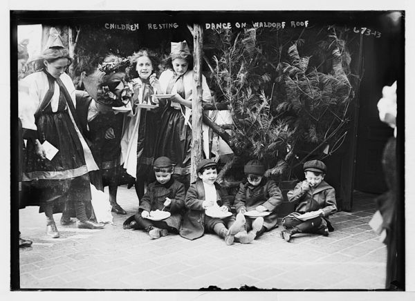 Children and dancers resting, eating, Waldorf roof, New York