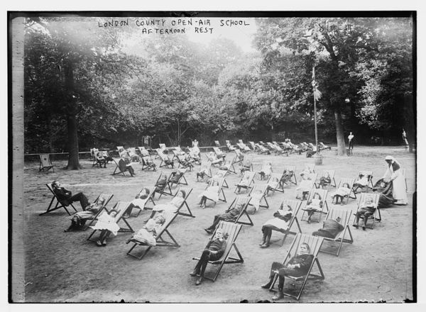 Children in chairs on lawn during afternoon rest, London County Open-air School