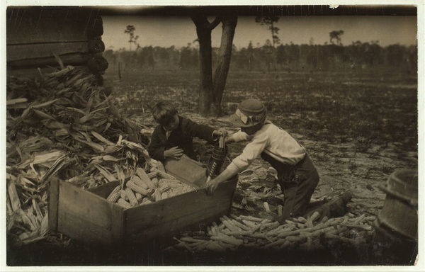Children thrashing corn during school hours on a farm near Dublin. Many such light occupations fall to the lot of the Georgia child. Location: Dublin vicinity, Georgia.