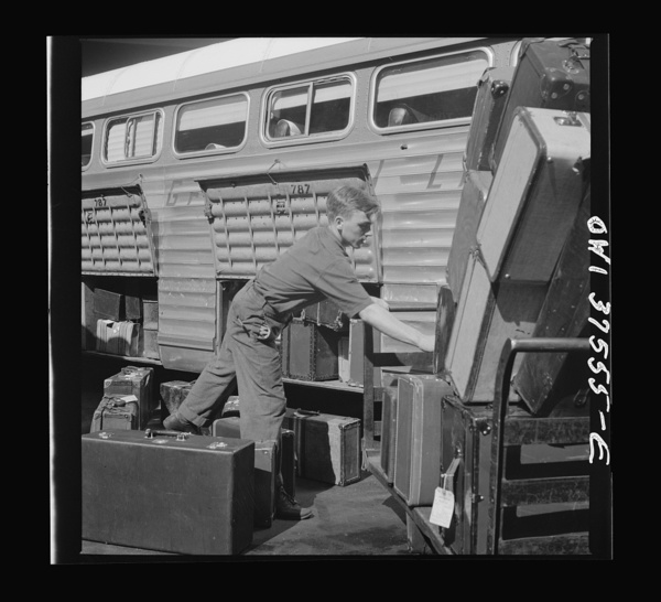 Cincinnati, Ohio. Loading baggage on a Greyhound bus at the bus terminal