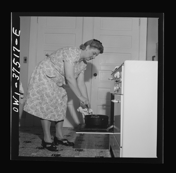 Cincinnati, Ohio. Mrs. Bernard Cochran, wife of a Greyhound bus driver, turning the Sunday roast