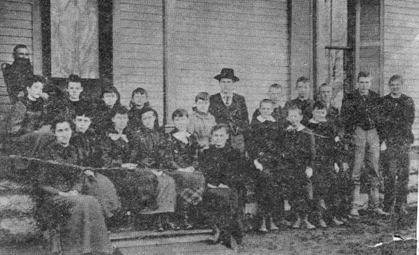 Class at Birdwhistell Academy. Only a few of the people have been identified: Dr. Sue Nevins, first row, left, and Mrs. Ford Daily is sixth from the left. Professor Birdwhistell is in the top left in the chair.