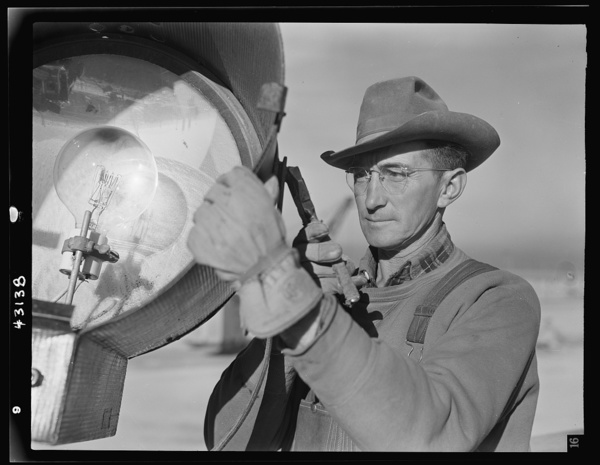 Columbia Steel Company at Geneva, Utah. Serving one of the floodlights that turn night into day at the big construction operations for a new steel plant which will make important additions to the vast amount of steel needed for the war effort