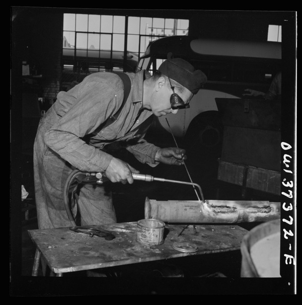 Columbus, Ohio. Fixing a bus part at the Greyhound garage