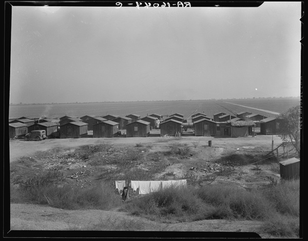 Company housing for Mexican cotton pickers, showing the San Joaquin Valley in the background. South of Corcoran, California