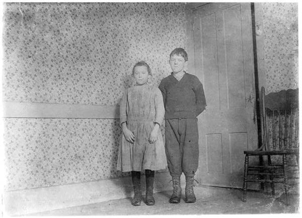 Compare ages: Veronica Mikula, says 12 years old, 93 N. Front St., Steven Mikula, (in mill) says 15 years, appears less than 14. Photo taken in spare unused room too cold to warm. They crowd together in kitchen. Location: New Bedford, Massachusetts.