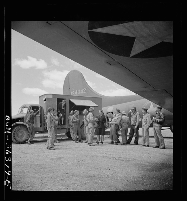 Constantine (vicinity), Algeria. A Red Cross clubmobile serving doughnuts and coffee to the crew of a bomber just returned to the airport from a dangerous mission