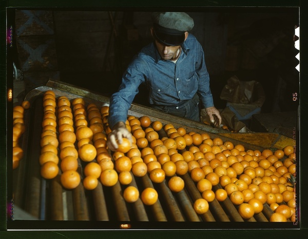 Grading oranges at a co-op orange packing plant, Redlands, Calif. Santa Fe trip