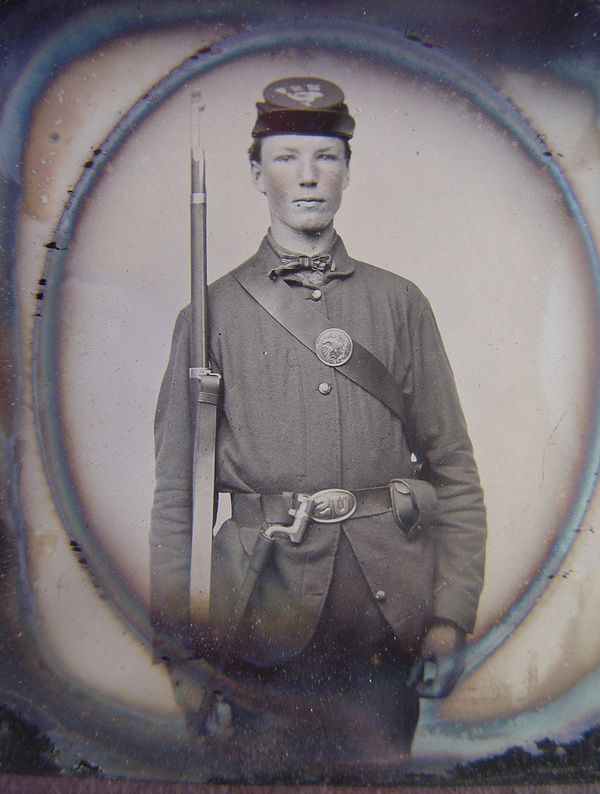 Corporal Alvin B. Williams of Company F, 11th Regiment New Hampshire Volunteers, with musket and a bayonet in scabbard; dog tag in case