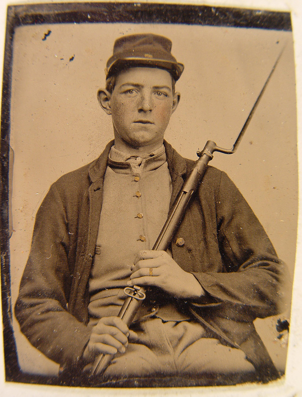 Corporal John A. Hartshorn of Company A, 19th Maine Infantry, in Union uniform sitting with bayoneted musket / From Walton's Ambrotype & Photograph Rooms, corner of Merrimack and Pecker Streets, Haverhill, Mass.