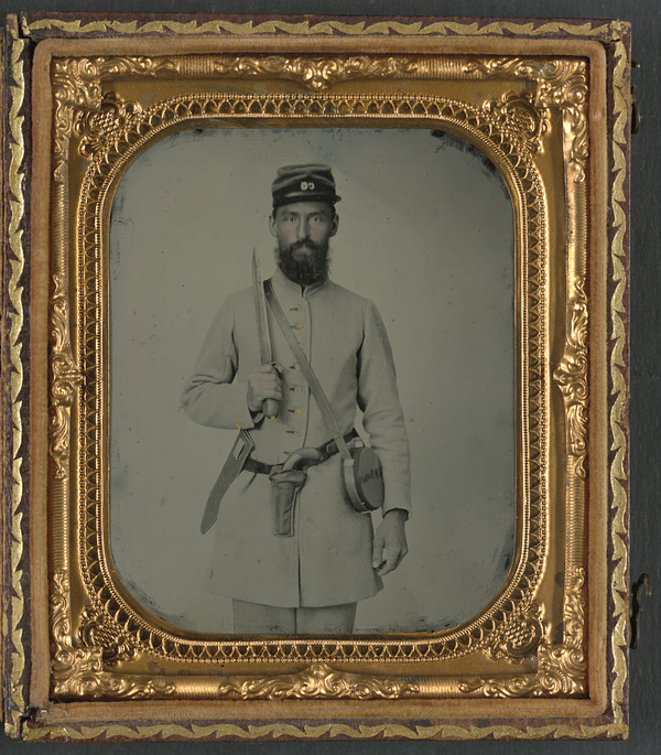 Corporal John Morton Booker of Co. I, 23rd Virginia Infantry Regiment, in uniform with Bowie knife, flintlock pistol, and tin drum canteen with his name on it