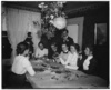 Orville Wright and group around a table, looking at photographs, during a party at 7 Hawthorn Street