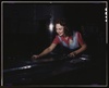Metal parts are placed on masonite by this woman employee before they slide under the multi-ton hydropress, North American Aviation, Inc., Inglewood, Calif.