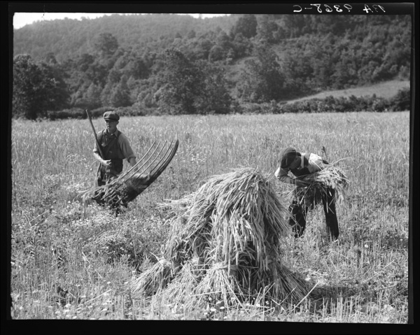 Cradling wheat near Sperryville, Virginia. A hand binder follows the mower. These men had never heard of a combine harvester. "Sure would like to see that." Their father used a reap hook