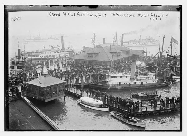 Crowd waiting to board excursion fleet and other ships, Hampton Roads