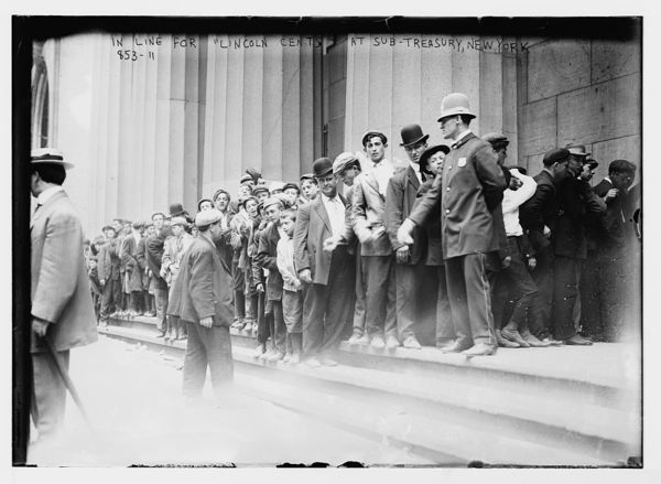 Crowd in line at Sub-Treasury Bldg, for "Lincoln Cents", New York