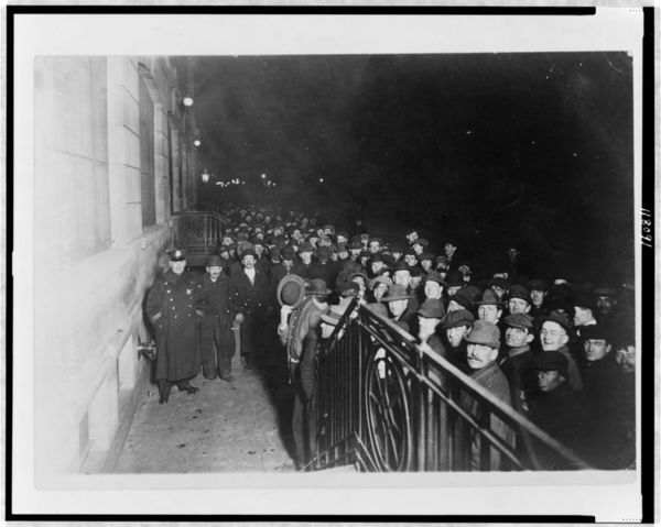 Crowd of men outside municipal lodging house, waiting for the doors to open, New York City