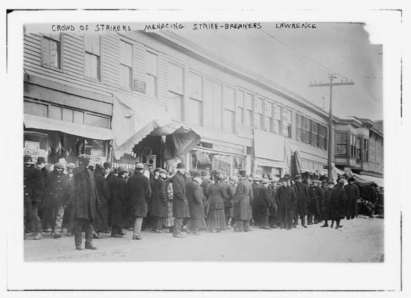 Crowd of strikers menacing strike-breakers, Lawrence