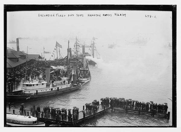 Crowd waiting to board excursion fleet and other ships, Hampton Roads
