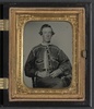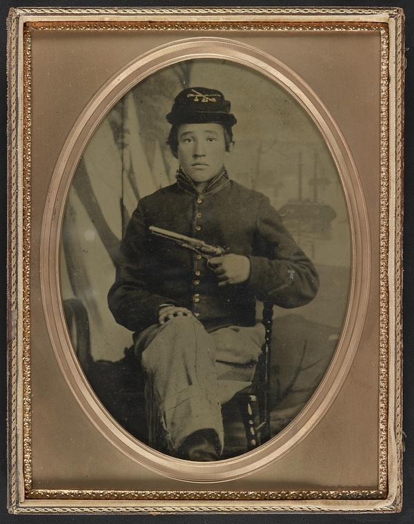 David Potts in Union cavalry uniform, with revolver, in front of painted background