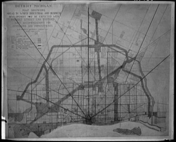 Detroit, Michigan, map showing areas in which industrial and business development may be expected with present street car systems with recommendations for