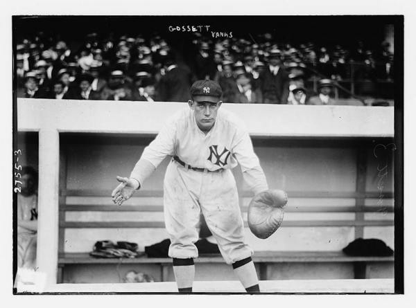 Unidentified catcher, New York AL, at left and Kid Gleason, Chicago AL, at right at the Polo Grounds, NY